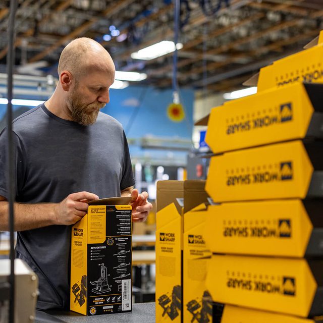 Work Sharp employee placing labels with Amazon Transparency Codes onto product boxes
